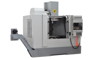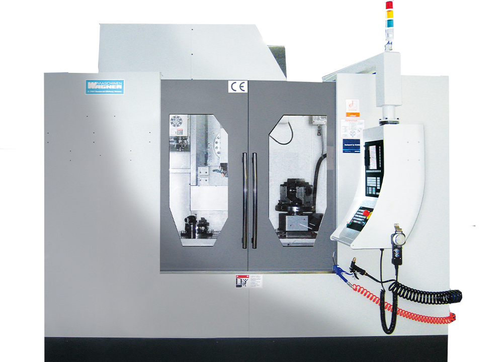 This CNC vertical machining center with 5 axes and double-arm tool changer with 30 magazine positions. Fully enclosed with cooling through the tool.