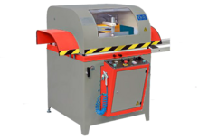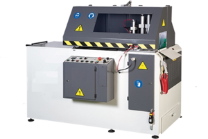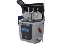 Semi-automatic mitre circular sawing machine or semi-automatic sawing machine with mitre cut on both sides for non-ferrous metals. Can also be used as an aluminum underfloor mitre circular saw.